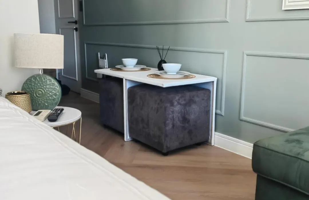 The property includes a fully equipped kitchen with air conditioning and a washing machine for utmost comfort.